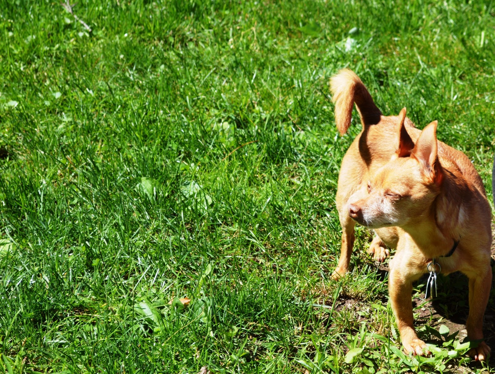 a rare photo frame with all 4 dogs in one shot, Chester is in the back checking out something important in the grass